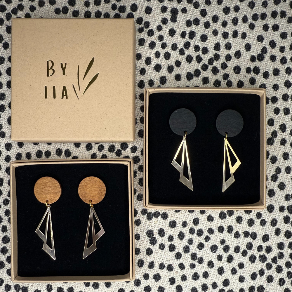 Anne-korvakorut ovat selkeälinjainen kokonaisuus, jossa puinen nappiosa ja 18k kullattu, graafinen riipus yhdistyvät. Puumateriaali tuo pehmeyttä, ja metallinen riipus lisää koruun rakennetta ja keveyttä.