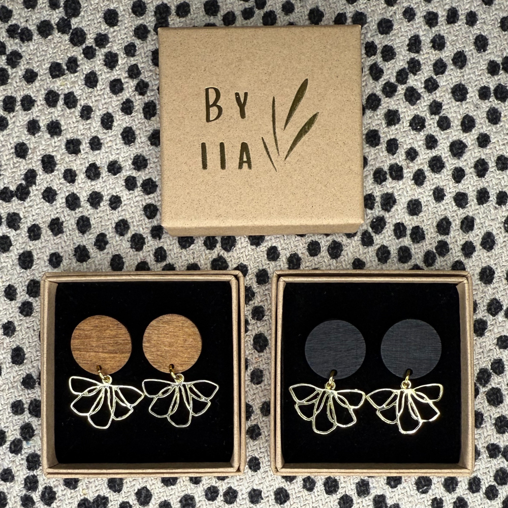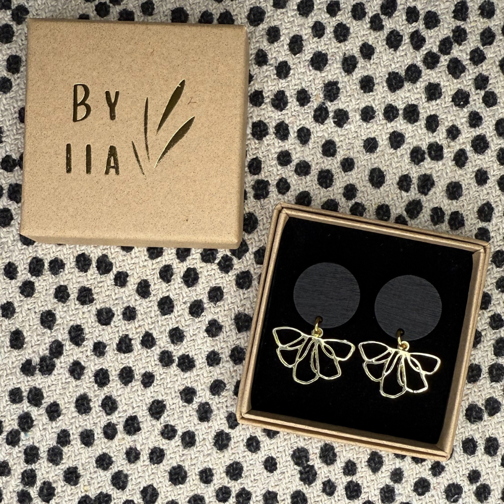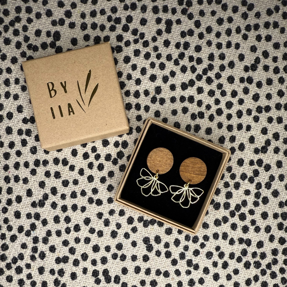 Selja on selkeälinjainen korvakoru, jossa puu ja kevyesti kaartuva, kukka-aiheinen kultainen riipus kohtaavat. Muoto on harkittu ja toimii sekä arjessa että rauhallisemmissa juhlahetkissä.
